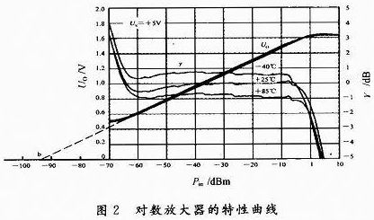 式中:b為截距;Ks為對(duì)數(shù)檢測器的斜率,是一個(gè)常數(shù);Pin是輸入信號(hào)的功率。在一定的動(dòng)態(tài)范圍內(nèi),可通過Matlab仿真軟件得到對(duì)數(shù)放大器的特性曲線,如圖2所示。