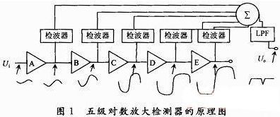 射頻信號(hào)檢測的實(shí)質(zhì)是如何實(shí)現(xiàn)將功率信號(hào)無失真地轉(zhuǎn)換成電壓信號(hào),而這個(gè)轉(zhuǎn)換工作則由對(duì)數(shù)放大檢測器來完成,因此,對(duì)數(shù)放大檢測器是射頻測量的關(guān)鍵。它的核心是對(duì)數(shù)放大器,對(duì)數(shù)放大器之間采用直接耦合方式,分成N級(jí),每級(jí)由對(duì)數(shù)放大器和檢波器組成。每級(jí)的輸出送到求和器,由求和輸出經(jīng)低通濾波器后得到一個(gè)電壓信號(hào)。N一般取值為5~9級(jí),級(jí)數(shù)越多,單級(jí)增益越小,則輸出特性曲線越趨向于線性,這里以5級(jí)為例進(jìn)行分析,具體電路如圖1所示。