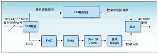 除了去隔行處理和誤碼校正,數(shù)字碼流還必須采用iBiquity公司的HD編解碼器(HDC)。同時(shí),如前所述還須并行處理模擬信號(hào)。最后,數(shù)字化的模擬音頻和數(shù)字音頻(來(lái)自HDC)混合在一起產(chǎn)生期望的HD無(wú)線音頻(見(jiàn)圖2)。