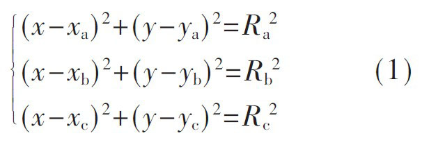 如圖3 所示, 在游戲場館C 區(qū)內(nèi), 設(shè)編號分別為a 、b 、c 的三個有源讀寫器的位置為(xa,ya) , (xb,yb) , (xc,yc) ,游客的位置坐標(biāo)(x,y), 三個讀卡器到游客的距離分別為Ra、Rb、Rc, 由時間信息定位方法(TOA) 可得式(1) , 即可求解游客的位置坐標(biāo)(x,y)。