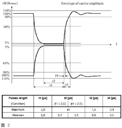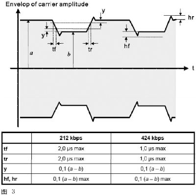 由于NFC106kbps為100%ASK調(diào)變,所以對(duì)整個(gè)High/Low信號(hào)的封包結(jié)構(gòu)都有相當(dāng)詳細(xì)的定義。其中幾個(gè)參數(shù)包括從100%下降到5%Am時(shí)間(t1)、5%Am持續(xù)時(shí)間(t2)、Am由5%上升至60%時(shí)間(t4)即overshoot的范圍。而212/424kbps則是8%~30%的調(diào)變率。