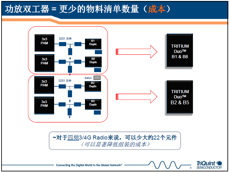 TRITIUM DUO™為每個頻帶都做了優(yōu)化,因此與可配置的放大器不同,它在放大完成后不需要切換,從而實現(xiàn)一個更高性能,更高效的射頻解決方案。而且TriQuint領先的無源器件可多模式操作,符合3G和4G標準,一個采用TRITIUM DUO™的4頻帶解決方案可有效降低物料清單成本,提升制造和供應鏈效率。