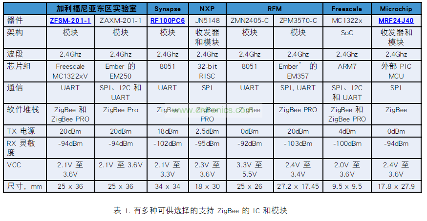 IC 和模塊中都提供有 ZigBee 解決方案(見表1)。 商業(yè)使用本規(guī)范不收取費用 - 制造商必須屬于 ZigBee 聯(lián)盟,最終產(chǎn)品必須