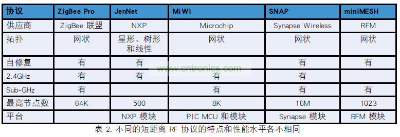 使用芯片制造商開發(fā)的專有協(xié)議可免去 ZigBee 許可證費(見表 2)。 NXP 提供 JenNet 協(xié)議,該協(xié)議在 2.4GHz 波段內(nèi)運行,能組建樹狀、星狀和線性自修復(fù)網(wǎng)絡(luò),最高包含500 個節(jié)點。 Microchip 的免費 MiWi 堆棧同時以 sub-GHz和 2.4GHz 兩種頻率,在 PIC 微控制器和 Microchip 收發(fā)器上運行。