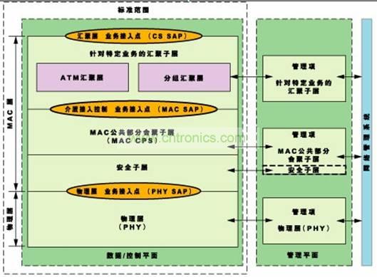 802.16 MAC協(xié)議是專門針對(duì)P2MP無線接入環(huán)境而設(shè)計(jì)的,可以支持諸如ATM、以太網(wǎng)和互聯(lián)網(wǎng)協(xié)議(IP)等傳輸協(xié)議,并且可以通過特定的匯聚層(如圖1所 示),適應(yīng)未來的技術(shù)發(fā)展。MAC層還可以利用物理層來實(shí)現(xiàn)很高的數(shù)據(jù)吞吐量,同時(shí)提供符合ATM標(biāo)準(zhǔn)的服務(wù)質(zhì)量(QoS),如UGS、rtPS、 nrtPS和盡高帶寬(BE)(如圖2所示)。