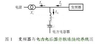 電力電容器由于諧波引起并聯(lián)諧振,則有異常電流流入電容器,其結(jié)果是導(dǎo)致電容器過熱,絕緣層被破壞。通常,當(dāng)電源阻抗充分小(電源設(shè)備容量大)時(shí)產(chǎn)生的故障很少,但要考慮高次諧波對(duì)低壓電力電容的影響,因此可使用帶6豫串聯(lián)電抗器的電力電容器來減小諧波干擾,電抗器與電力容器、變頻器連接圖如圖1所示。