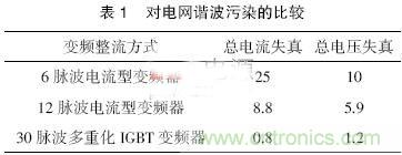 為了將諧波產(chǎn)生的種種干擾防患于未然,應(yīng)該在發(fā)生源(變頻器)側(cè)抵制高次諧波。首先主電路可選擇采用多脈沖數(shù)整流、多電平輸出形式,諧波少對(duì)電網(wǎng)的污染也小,如表1 所列。從表中看出主電路整流脈波數(shù)多三電平輸出可達(dá)到高標(biāo)準(zhǔn)的要求。還可采用動(dòng)態(tài)消除諧波的方法,當(dāng)然成本就會(huì)增加,但要比較權(quán)衡。
