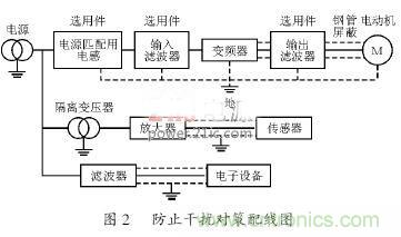 為了防止干擾,采用圖圓所示的方案。變頻器本身用鐵殼屏蔽,輸出線用鋼管屏蔽,并與其它弱電信號(hào)分別配線,附近的其它靈敏電子設(shè)備線路也要屏蔽;為了減少電磁噪聲,可以配置輸出濾波器;為了減少對(duì)電源的污染,可配置輸入濾波器或零序電感,還可與晶閘管整流裝置,功率因數(shù)補(bǔ)償器并聯(lián)使用。電源變壓器容量大于10倍變頻器容量,或電源電壓不平衡率超過3豫時(shí)需接電源匹配用電感器,采用電感后對(duì)電源改善效果良好,小容量變頻器安裝有匹配電感時(shí)使功率因數(shù)有提高,大容量時(shí)雖對(duì)功率因數(shù)無提高,但可改善變頻器運(yùn)行,同時(shí)起到濾波作用。