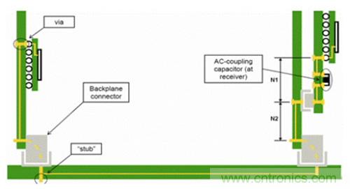下圖所示是一個典型的高速信號互連鏈路,信號傳輸路徑包括:①發(fā)送端芯片(封裝與PCB過孔)②子卡PCB走線③子卡連接器④背板PCB走線⑤對側(cè)子卡連接器⑥對側(cè)子卡PCB走線⑦AC耦合電容⑧接收端芯片(封裝與PCB過孔)