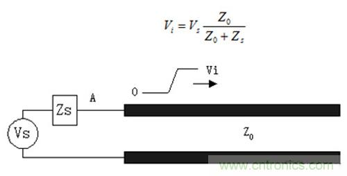 下圖描繪了加在長的傳輸線上的初始波形,初始的電壓Vi傳送到傳輸線上直到到達末端,Vi的幅度通過驅(qū)動器電阻和傳輸線阻抗的分壓來決定:
