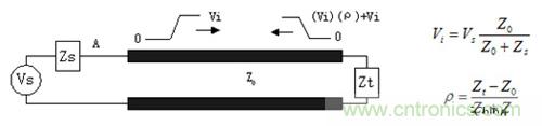 如下圖所示當輸入波形遇到端接Zt,信號的一部分Viρ被反射回源端并且加在輸入波形上,整個輸入信號波形幅度為Viρ+Vi。反射的部分可能從源產(chǎn)生另一個反射,反射和逆反射一直持續(xù)直到傳輸線穩(wěn)定。