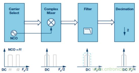 典型DDC模塊包括載波選擇、下變頻器、濾波器和抽取器。這些功能模塊按順序工作,或者可分別予以旁路,最終根據(jù)后續(xù)FPGA或ASIC(其采樣速率較低)的要求,產(chǎn)生一個位于DC的復(fù)信號或一個實信號。