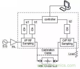 題外話(huà):其實(shí)功率系數(shù)這個(gè)東東,不光是衰減器有,所有工作在大功率條件下的器件都有,只要工作功率的變化范圍比較大,就必須要考慮這個(gè)指標(biāo)。如何測(cè)試這個(gè)指標(biāo),一般需要一套標(biāo)準(zhǔn)的測(cè)試系統(tǒng),當(dāng)然也可以自己來(lái)搭建。下圖就是上篇提到的一個(gè)標(biāo)準(zhǔn)的測(cè)試功率系數(shù)的框圖,供大家參考: