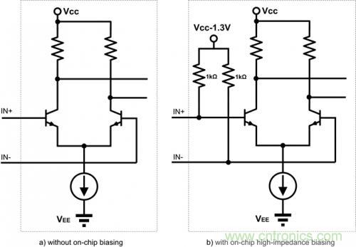 PECL 的輸入是一個具有高輸入阻抗的差分對,該差分對的共模電壓需要偏置到VBB =VCC-1.3V,這樣允許的輸入信號電平動態(tài)最大。對于不同芯片的輸入級,信號允許的共模電平可能會有些差異,請參考相應的datasheet。有部分芯片在內(nèi)部已經(jīng)集成了偏置電路,使用時直接連接即可,有的芯片沒有加,使用時需要在芯片外部加直流偏置。