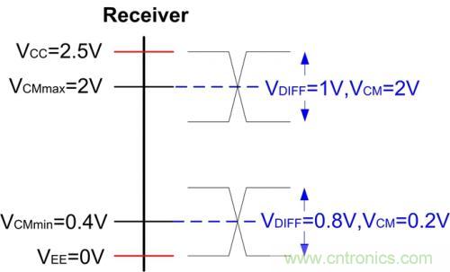 那么其接收窗口如下圖所示,圖中標出了共模電壓為最大或者最小時,其允許的最大單端電壓。