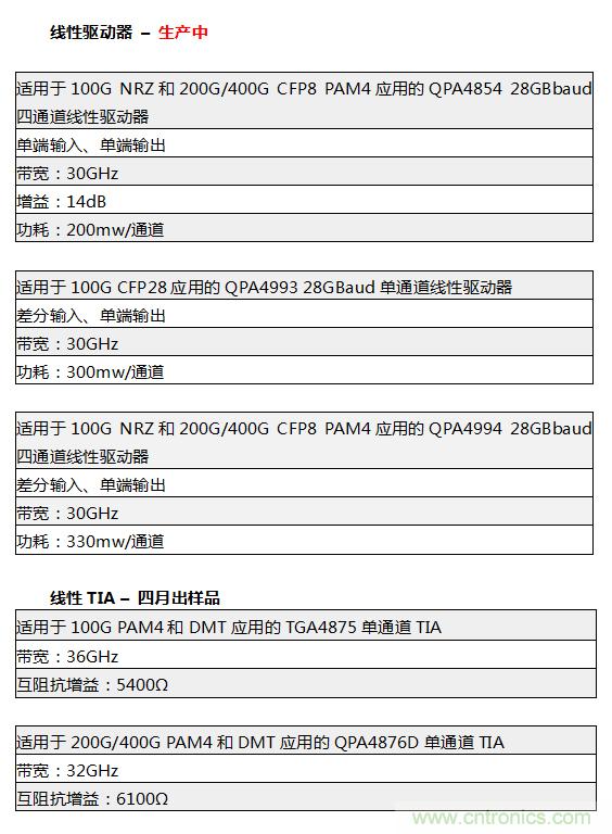 Qorvo全新的線性驅(qū)動(dòng)器目前正在嵌入到光纖網(wǎng)絡(luò)系統(tǒng)中。單通道互阻抗放大器(TIA)預(yù)計(jì)四月可以出樣品。其他的四通道驅(qū)動(dòng)器和新的互阻抗放大器(TIA)將于2017年底上市。