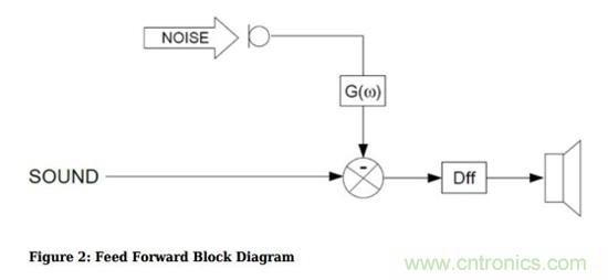 如果把系統(tǒng)畫成信號(hào)流圖,就是下圖,噪聲在麥克風(fēng)采樣后進(jìn)入信號(hào)處理電路,產(chǎn)生“反”噪聲,并與音樂(lè)一起送進(jìn)耳機(jī)內(nèi)。這種模式稱為前饋有源噪聲消除。