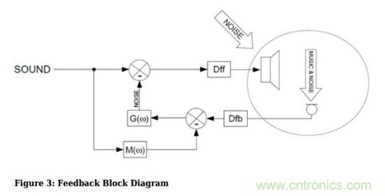 在反饋有源噪聲消除方案中,麥克風(fēng)采樣的不是直接的環(huán)境噪聲,而是耳機(jī)輸出處的聲音,顯然這里的聲音包括了音樂(lè)和環(huán)境噪聲。那么如何選擇性地抵消掉噪聲但是保留音樂(lè)呢?就需要把這里采樣到的聲音減去音樂(lè),這樣剩下的信號(hào)就全是噪聲了;然后再根據(jù)這個(gè)噪聲去產(chǎn)生噪聲抵消信號(hào)。這樣做的話,就不會(huì)有風(fēng)噪問(wèn)題。然而,這里又有一個(gè)新問(wèn)題,就是反饋系統(tǒng)通常帶寬會(huì)遠(yuǎn)小于前饋系統(tǒng),因此使用反饋模式的有源噪聲消除對(duì)于高頻噪聲的抵消作用有限。