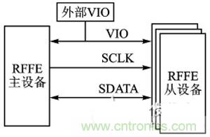 RFFE是MIPI聯(lián)盟針對射頻前端設備所提出的控制規(guī)范。單個總線上可以掛載1個主機,同時最多掛載15個從機。該總線使用2條信號線,一條是主機控制的時鐘線SCLK,另一條是雙向數(shù)據(jù)線SDATA,此外還有一條參考電壓線VIO。VIO可由主機提供,也可由外部提供。SCLK的標準頻率是32kHz-26MHz,擴展頻率是26MHz-52MHz,在空閑時SCLK和SDATA保持低電平。