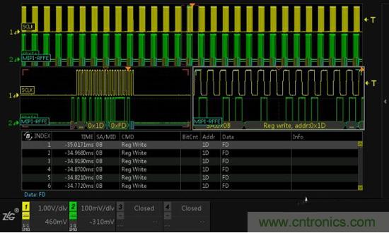 圖3為RFFE的通信例程,使用ZDS4054分析總線非常簡單,將示波器探頭分別接在SCLK和SDATA線上,將總線通信數(shù)據(jù)采集回來,然后開啟MIPI-RFFE協(xié)議解碼,簡單設置參數(shù)后,即可完成協(xié)議分析。