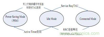 TAU周期請求定時器(T3412)由網(wǎng)絡側在ATTCH和TAU消息中指定,3GPP協(xié)議規(guī)定默認為54min,最大可達310H。那么UE處理完數(shù)據(jù)之后,什么時候進入PSM模式呢?這是由另一個定時器Activer Timer(T3324,0-255秒)決定的。UE處理完成數(shù)據(jù)之后,RRC連接會被釋放、進入空閑態(tài),與此同時啟動Active Timer,此Timer超時后,UE即進入上述PSM模式。轉換狀態(tài)如下(借圖):