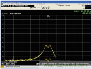 圖5:LTC6946 的輸出頻譜,在 4GHz 輸出、環(huán)路帶寬為 2MHz 時(shí)展示了不同尋常的低雜散噪聲