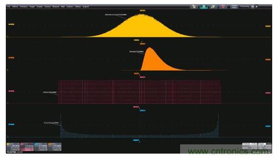 在許多應(yīng)用中,兩個(gè)或多個(gè)隨機(jī)過(guò)程可能發(fā)生交互。當(dāng)這種情況發(fā)生時(shí),過(guò)程的概率密度會(huì)進(jìn)行數(shù)學(xué)卷積運(yùn)算。一個(gè)常見的例子是結(jié)合了隨機(jī)和確定性抖動(dòng)分量的時(shí)序抖動(dòng)。圖5顯示了結(jié)合在一起的高斯和正弦分量,源分布位于上面兩張圖,從上往下數(shù)的第三張分布圖是兩個(gè)源卷積的結(jié)果。許多先進(jìn)的示波器提供可選的抖動(dòng)或噪聲分析包,這些分析包可以將這些組合式分布分開,單獨(dú)測(cè)量分量。