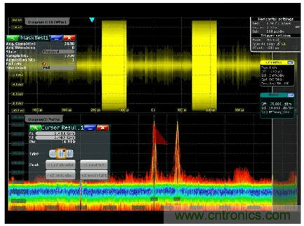 很多用慣了示波器的人都喜歡示波器的觸發(fā)功能,用各種觸發(fā)方式來隔離各種事件,穩(wěn)定顯示,觀察異常。在傳統(tǒng)頻譜儀上是很難實現(xiàn)觸發(fā)的,但是當我們發(fā)現(xiàn)示波器的模板觸發(fā)方式,很容做到,把時域波形的實時頻譜變到頻域來觀察,借助MASK 測試的一些小工具,居然輕松設置和輕松觸發(fā)。因為模板的形狀自由編輯,觸發(fā)的動作自由組合,這樣的波形分析已經(jīng)完全跨越的時域和頻域的使用習慣,完全融合了時域和頻域?qū)π盘柕乃季S方法了。