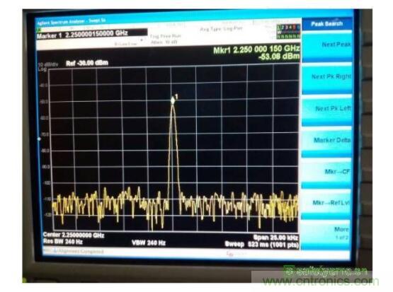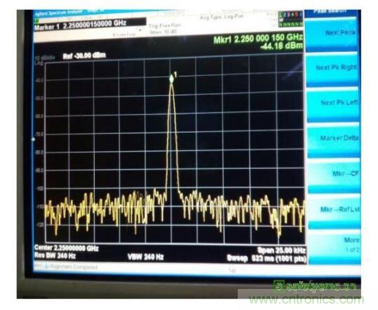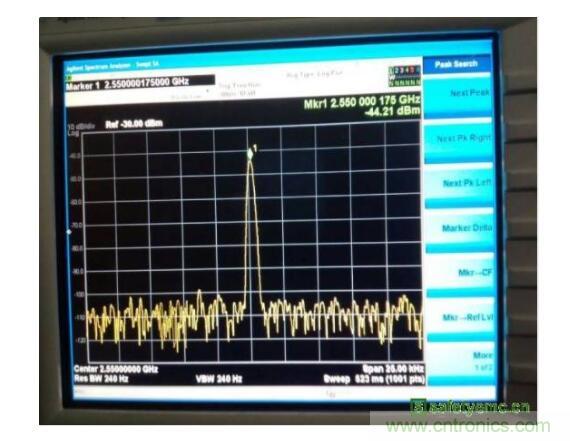 針對輻射問題,我們要尋找出干擾的噪聲,使用頻譜分析儀在頻域分析會更快速精準(zhǔn)的找出方案。這里我們使用性價(jià)比較高的CXA N9000A頻譜分析儀,搭配使用N9311X 套件中的磁場環(huán)形探針來掃描手機(jī)的近場雜訊。通過使用較低靈敏度的環(huán)形探頭可以發(fā)現(xiàn)在天線區(qū)域存在較大的諧波,如圖3所示 2.55GHz峰值達(dá)到了 -43.29dBm。