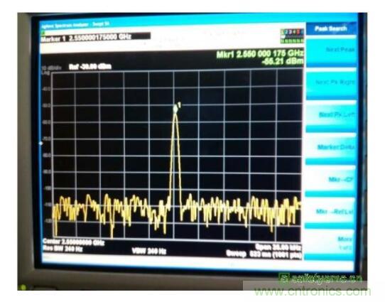 從測試結(jié)果來看,諧波超標(biāo)很嚴(yán)重,這一點(diǎn)與天線區(qū)域的雜訊信號很相似,考慮到傳導(dǎo)嫌疑已經(jīng)排除,因此分析的重點(diǎn)集中到了天線區(qū)域的非線性器件。從如圖4所示原理圖可以看出,天線的調(diào)諧開關(guān)是正常工作的,由于天線開關(guān)本身是非線性器件,因此首先確認(rèn)天線開關(guān)的影響。將天線開關(guān)旁路(天線仍然正常)如圖5所示,發(fā)現(xiàn)此時2.55GHz的雜訊可以降低到-55.7dBm左右,因此可以確定天線區(qū)域的雜訊就是調(diào)諧開關(guān)造成的。