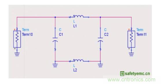 由于2.25GH大約是750MHz的三次諧波,因此我們首先針對750MHz做濾波設(shè)計(jì)。為了克服這種干擾應(yīng)該對基帶信號加以濾波,阻止高頻成分傳播和搬移。如圖8所示是一種推薦電路,其中電容C1、C2和L2可作為備選,將此電路加在圖6黃色框圖標(biāo)示的電源入射端口附近做濾波。
