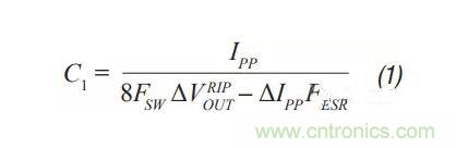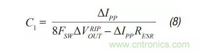 第1步:正如之前的拓?fù)?,選擇C1,使其等于沒有輸出濾波器時的情況。10 mV p-p至100 mV p-p是個不錯的開始,具體取決于最終目標(biāo)輸出紋波。C1隨后可通過公式8計算得出。C1在這個拓?fù)渲锌梢圆捎帽戎巴負(fù)涓〉臄?shù)值,因為濾波器效率更高。