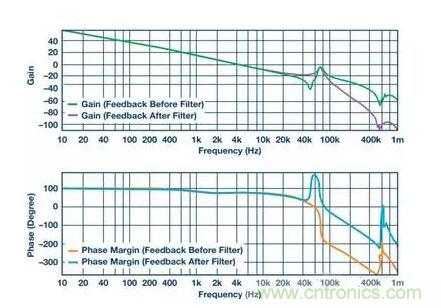 反饋在濾波器電感之前或之后獲取。人們沒有想到的是,哪怕濾波器不在反饋環(huán)路內(nèi)部,開環(huán)波特圖依然存在非常大的變化。由于控制環(huán)路無論濾波器是否在反饋環(huán)路中都會受影響,因此也應(yīng)對其進(jìn)行適當(dāng)補償。一般而言,這意味著將目標(biāo)交越頻率向下調(diào)整至不超過濾波器諧振頻率(FRES)的五分之一到十分之一。