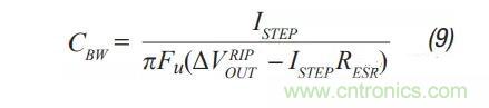 第3步:如前所述,添加濾波器會影響轉(zhuǎn)換器補償,具體表現(xiàn)為降低可實現(xiàn)的交越頻率(Fu)。根據(jù)公式7的計算,對于電流模式轉(zhuǎn)換而言,可實現(xiàn)的最大Fu是開關(guān)頻率的1/10以下,或者是濾波器FRES的1/5以下。幸運的是,大部分模擬負(fù)載不需要太高的瞬態(tài)響應(yīng)。公式9計算轉(zhuǎn)換器輸出所需的輸出電容近似值(CBW),以提供指定的瞬態(tài)電流階躍。