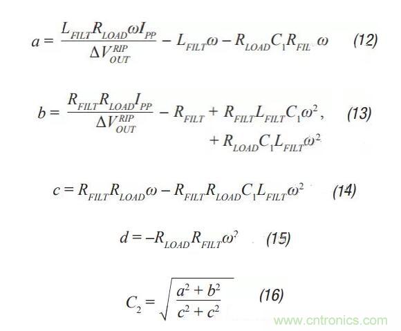第3步:C2隨后可通過公式2至公式6計算得出。A、a、b和c是簡化計算的中間值,沒有實際意義。這些公式假定R < />LOAD,且每個電容的ESR較小。這些都是很好的假設(shè),引入的誤差很小。C2應(yīng)等于或大于C1??烧{(diào)節(jié)第1步中的紋波,使其成為可能。