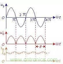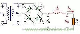 在橋式整流電路中,當(dāng)u2正半周時(shí),D1、D3導(dǎo)電,電感中的電流將滯后u2不到90°。當(dāng)u2超過90°后開始下降,電感上的反電勢(shì)有助于D1、D3繼續(xù)導(dǎo)電。當(dāng)u2處于負(fù)半周時(shí),D2、D4導(dǎo)電,變壓器副邊電壓全部加到D1、D3兩端,致使D1、D3反偏而截止,此時(shí),電感中的電流將經(jīng)由D2、D4提供。由于橋式電路的對(duì)稱性和電感中電流的連續(xù)性,四個(gè)二極管D1、D3;D2、D4的導(dǎo)電角θ都是180°,這一點(diǎn)與電容濾波電路不同。