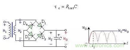 式中包括變壓器副邊繞組的直流電阻和二極管的正向?qū)娮琛S捎谝话愫苄?,電容器很快就充到交流電壓u2的最大值,如波形圖2(b)的時(shí)刻。此后,u2開始 下降,由于電路輸出端沒接負(fù)載,電容器沒有放電回路,所以電容電壓值uC不變,此時(shí),uC>u2,二極管兩端承受反向電壓