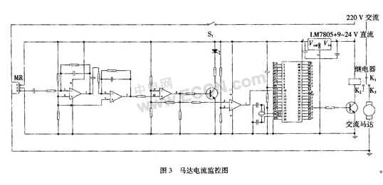 本文研制的電流傳感器已經(jīng)在馬達(dá)監(jiān)控方面獲得了實際應(yīng)用。眾所周知,馬達(dá)一旦被意外卡死而停轉(zhuǎn),電路中流過它的電流會遠(yuǎn)遠(yuǎn)高于正常工作的電流,而馬達(dá)長時間停轉(zhuǎn)的話,很容易被燒壞,本電流傳感器就是要感知馬達(dá)停轉(zhuǎn)的電流,從而把整個供電斷開,起到保護(hù)馬達(dá)的作用,其基本原理如圖3所示。