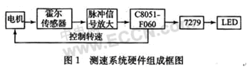 本系統(tǒng)采用單片機C8051F060作為主控制器,使用霍爾傳感器測量電機的轉(zhuǎn)速,通過7079最終在LED上顯示測試結(jié)果。此外,還可以根據(jù)需要調(diào)整控制電機的轉(zhuǎn)速,硬件組成由圖1所示。