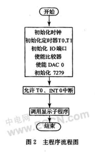 控制器C8051F060主要完成轉(zhuǎn)速脈沖的采集、16為定時計數(shù)器計數(shù)定時、運算比較,片內(nèi)集成的12位DAC0控制轉(zhuǎn)速,并且通過7279顯示接口芯片實現(xiàn)數(shù)碼顯示等多項功能。系統(tǒng)采用外部晶振,系統(tǒng)時鐘SYSCLK等于18432000,T0定時1 ms,初始化時TH0=(-SYSCLK/1 000)》8;TL0=-SYSCLK/1 000。等待1 s到,輸出轉(zhuǎn)速脈沖個數(shù)N,計算電機轉(zhuǎn)速值。將1 s內(nèi)的轉(zhuǎn)速值換算成1 min內(nèi)的電機轉(zhuǎn)速值,并在LED上輸出測量結(jié)果。