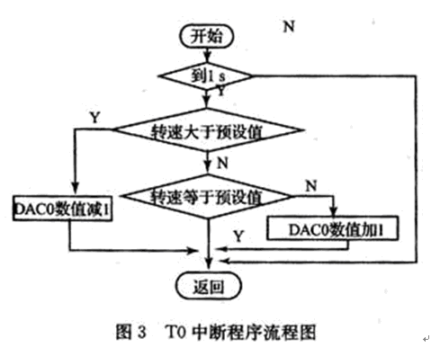 本系統(tǒng)采用C8051F060中的INT0中斷對轉(zhuǎn)速脈沖計數(shù)。定時器T1工作于外部事件計數(shù)方式對轉(zhuǎn)速脈沖計數(shù);T0工作于定時器方式均工作于方式1。每到1 s讀一次計數(shù)值,此值即為脈沖信號的頻率,根據(jù)式(1)可計算出電機的轉(zhuǎn)速。由于直流電機的轉(zhuǎn)速與施加工于電機兩端的電壓大小有關(guān),故將實際測得的轉(zhuǎn)速值與預(yù)設(shè)的轉(zhuǎn)速值比較,若大于預(yù)設(shè)的轉(zhuǎn)速值則減小DAC0的數(shù)值,若小于轉(zhuǎn)速預(yù)設(shè)的轉(zhuǎn)速值則增加DAC0的值調(diào)整電機的轉(zhuǎn)速,直到轉(zhuǎn)速值等于預(yù)設(shè)定的值,這樣就實現(xiàn)了對電機轉(zhuǎn)速的控制,主程序和T0中斷流程圖如圖2、3所示。