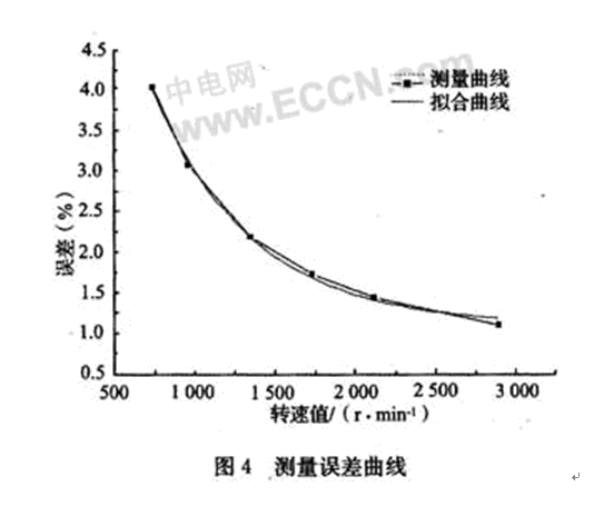 首先在軟件中給出轉(zhuǎn)速預(yù)設(shè)值,即給定常量speed的值,觀察速度穩(wěn)定后七段數(shù)碼管的數(shù)值,比較實際測量的轉(zhuǎn)速值和預(yù)設(shè)轉(zhuǎn)速值,計算測量誤差,評價測量的準(zhǔn)確性,測試結(jié)果如表1所示。根據(jù)實驗測試和誤差分析繪制了測量誤差曲線,如圖4所示。誤差分析表明,轉(zhuǎn)速測量誤差在5%以內(nèi),并且隨著轉(zhuǎn)速預(yù)設(shè)值的增加測量誤差愈小,呈指數(shù)形式下降,函數(shù)關(guān)系如式(3)所示。