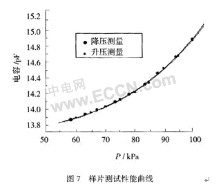 在室溫19.34℃的條件下,對(duì)壓力傳感器進(jìn)行測量。測量設(shè)備為Druck的DPI610IS,測量電路采用了AD公司的AD7745電容測量芯片,精度能達(dá)到4 fF。測量曲線如圖7所示,測試精度為8.1‰。由于硅薄膜較厚,測量范圍內(nèi)的線性部分不多,此外電容電極的面積利用率不高使得電容的變化量也小,這些都是造成性能不高的主要原因,但由圖可以看出測量曲線存在很好的一致性和重復(fù)性。