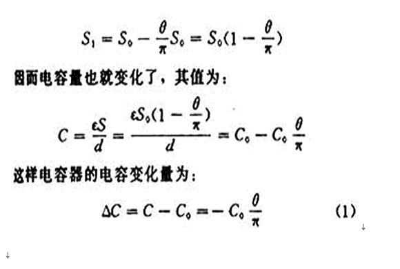 圖1是3種這類傳感器的原理圖,圖1(a)中是利用角位移來改變電容器極板遮蓋面積。假定當2塊極板完全遮蓋時的面積為S0,兩極板間的距離為d,極板間介質(zhì)的介電常數(shù)為ε。當忽略邊緣效應時,該電容器的電容量為: