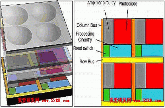 比較 CCD 和 CMOS 的結(jié)構(gòu),放大器的位置和數(shù)量是最大的不同之處,Mr.OH! 會在下一講 CCD 感光元件工作原理(上),提及完整的感光元件作業(yè)流程。此講中,Mr.OH!簡單地解釋:CCD 每曝光一次,自快門關(guān)閉或是內(nèi)部時脈自動斷線(電子快門)后,即進行畫素轉(zhuǎn)移處理,將每一行中每一個畫素(pixel)的電荷信號依序傳入『緩沖器(電荷儲存器)』中,由底端的線路導(dǎo)引輸出至 CCD 旁的放大器進行放大,再串聯(lián) ADC(類比數(shù)位資料轉(zhuǎn)換器) 輸出;相對地,CMOS 的設(shè)計中每個畫素旁就直接連著『放大器』,光電訊號可直接放大再經(jīng)由 BUS 通路移動至 ADC 中轉(zhuǎn)換成數(shù)位資料。