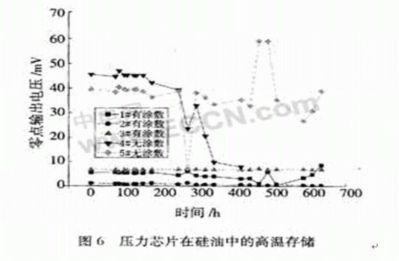 1#,2#,3#涂敷了保護層,4#,5#沒有涂敷保護層??梢钥吹?,沒有保護層的傳感器在高溫下存儲了約200 h后,它的零點突然發(fā)生了變化,之后數(shù)據(jù)不穩(wěn)定;涂了保護層的壓力傳感器的零點在600多小時后仍然很穩(wěn)定。因此,為了防止硅油的污染導(dǎo)致壓力傳感器的失效,我們采取了一些必要的措施。首先,選擇高溫下盡可能穩(wěn)定的硅油;其次,盡量選擇具有良好鈍化層的芯片;最后,在不影響靈敏度的前提下,還可以在封裝過程中對芯片以及引線進行涂敷鈍化層的處理。