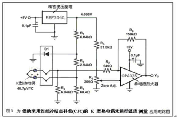 圖4為該應(yīng)用電路圖。該熱電偶測量電路采用自動置零、單電源放大器opa335。精密電壓基準ref3040提供4.096v的橋式電源。二極管d1的正向電壓具有-2mv/℃的負溫度系數(shù),并通過電阻器網(wǎng)絡(luò)r1-r3來提供冷結(jié)點補償。