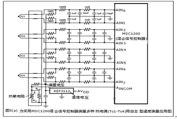 圖5(a)為采用mscl200的多熱電偶用自主型溫度測量應(yīng)用圖。該溫度測量電路采用混合信號控制器mscl200來測量四種不同類型的熱電偶(tc1-tc4)的差分輸出電壓和參考溫度。