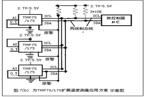 tmp75 和tmpl75是二線式、串行輸出溫度傳感器,其內(nèi)部組成框圖見圖7(a)所示。這些器件無需使用外部元件,并能夠以0.0625℃的分辨率來顯示溫度讀數(shù)。二線式接口與smbus兼容,從而允許tmpl75在一根總線上連接多達27部設(shè)備(而tmp75則最多可在一根總線上連接8部設(shè)備)。這兩款器件均具有smbus報警功能,是工業(yè)環(huán)境中常見的擴展溫度測量應(yīng)用(見圖7(b)所示)的理想選擇。