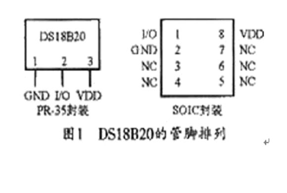 DS18B20采用3腳PR-35封裝或8腳SOIC封裝,其管腳排列如圖1所示。圖中,GND為地;I/O為數(shù)據(jù)輸入/輸出端(即單線總線),該腳為漏極開路輸出,常態(tài)下呈高電平;VDD是外部+5 V電源端,不用時應接地。
